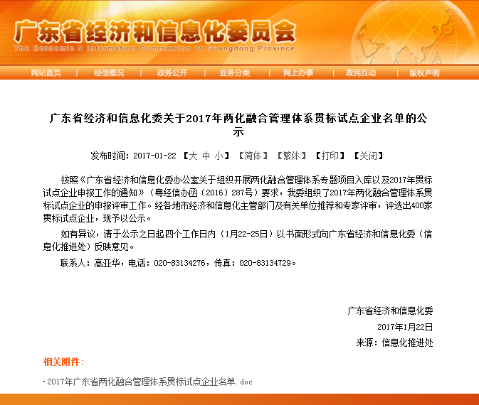 广东省经济和信息化委关于2017年两化融合管理体系贯标试点企业名单的公示